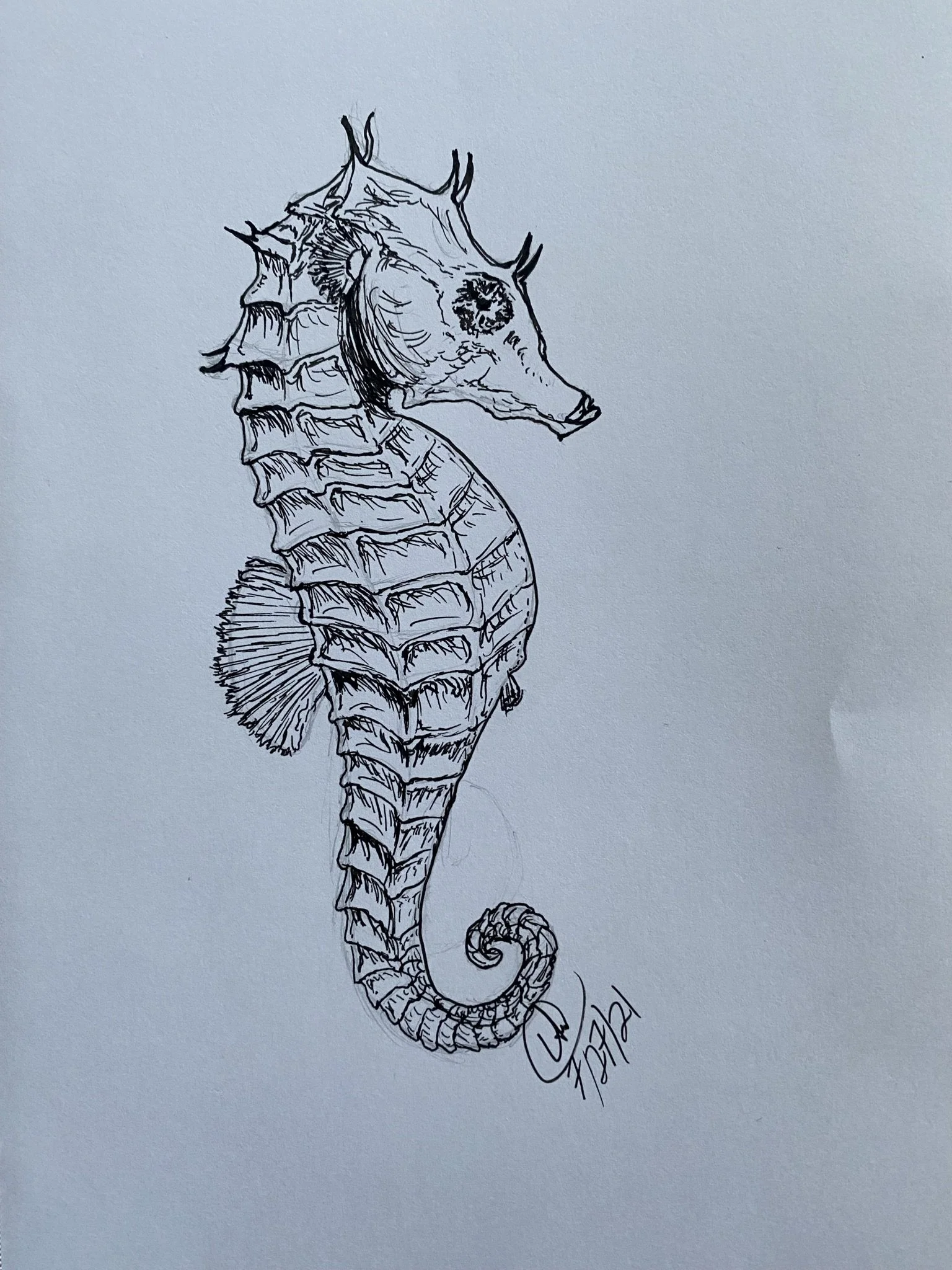 Finished in July 2021, “Drift” is a simple pen-and-ink illustration of a seahorse. I focused on graceful, flowing lines to convey movement and elegance, celebrating the delicate balance between strength and vulnerability.