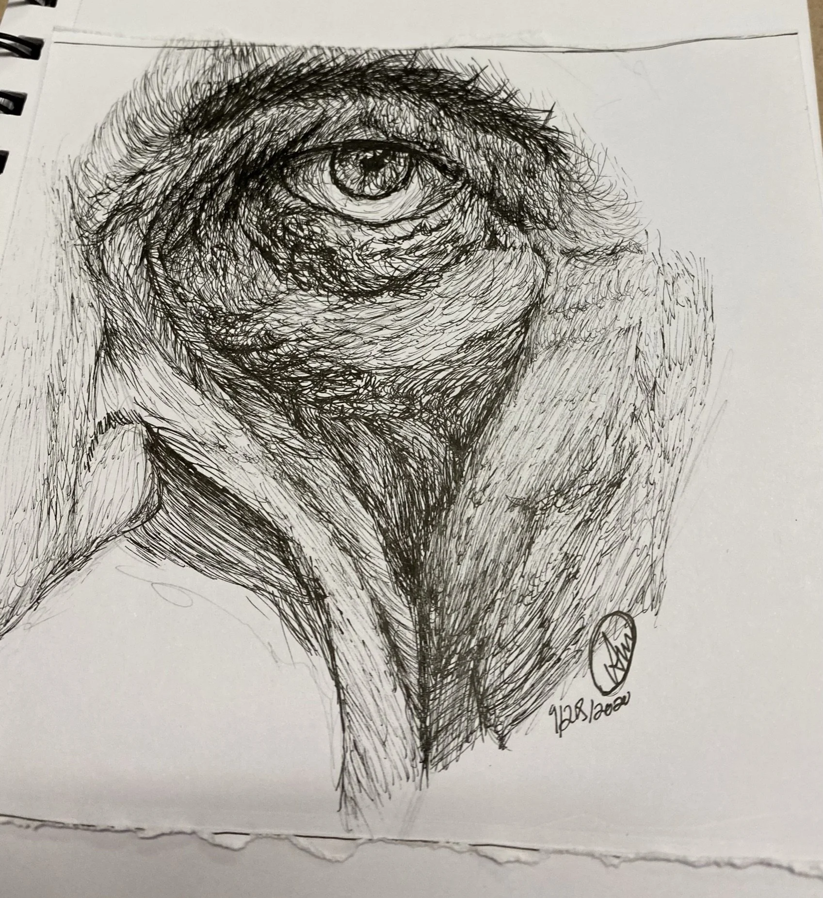 Completed in September 2020, “The Old Man” is a contemplative portrait focusing on the deep lines and weathered features of an elderly figure. The detailed pen-and-ink work pays homage to the wisdom and character that time imprints on us all. Inviting reflection on the passage of time and the wisdom etched into every crease.