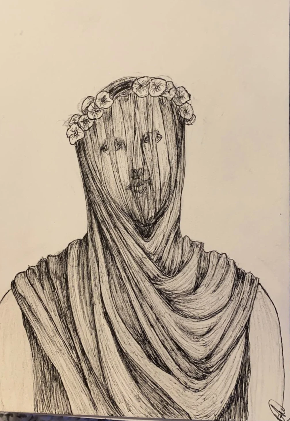 Completed in December 2020, “The Veiled Lady” reimagines a classic statue with a contemporary twist. Through delicate pen and ink, I emphasized the interplay of light and shadow on flowing drapery, creating an air of mystery and timeless elegance.
