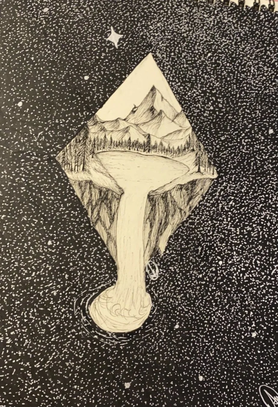 Finished in August 2021, “Void” is a pen-and-ink study that juxtaposes a serene mountain waterfall with an endless cosmic expanse. I explored the contrast between the tangible and the infinite, inviting contemplation of what lies beyond the visible.